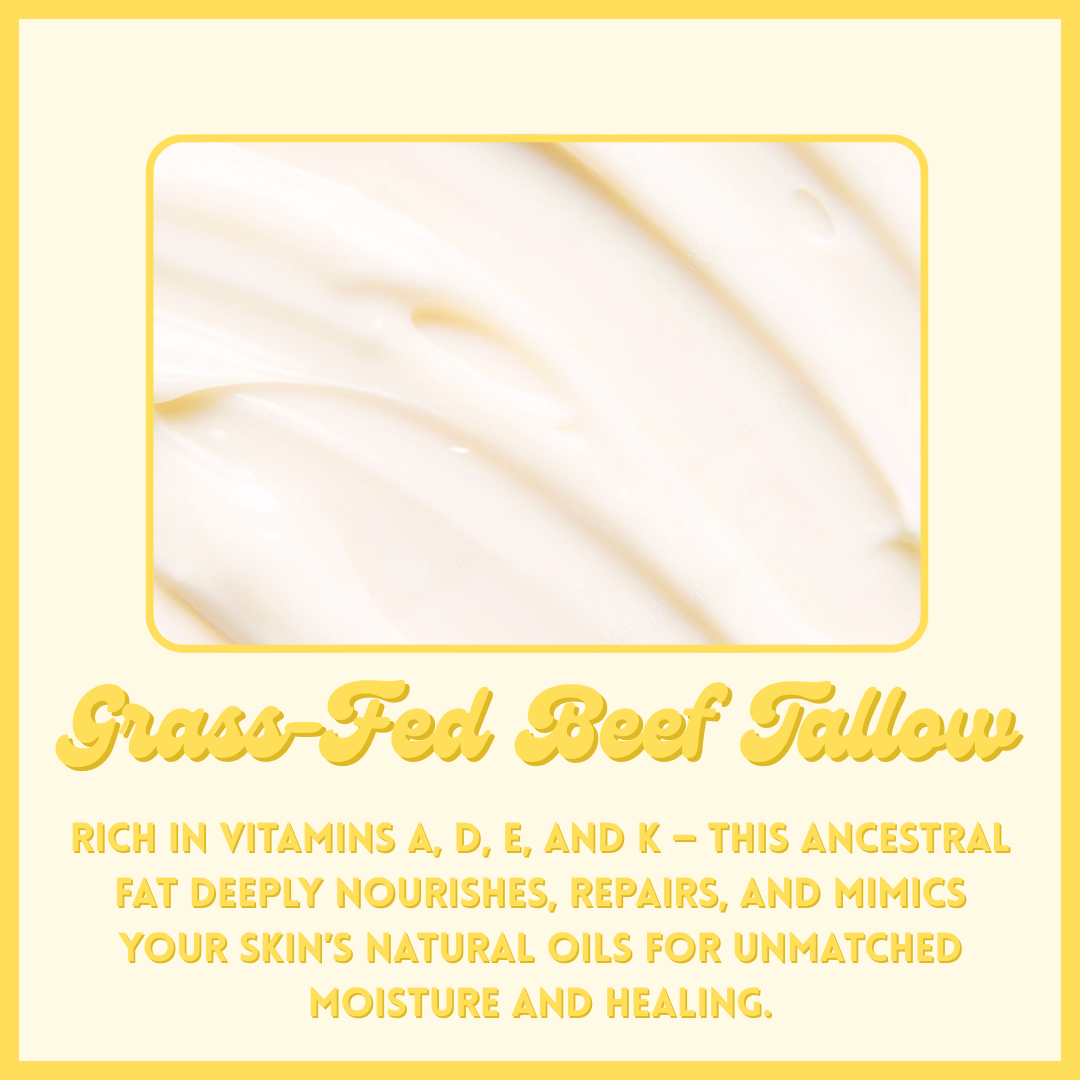 Renowned for its unique bioavailability and nutrient-dense profile, our tallow is rich in skin-loving vitamins A, D, E, and K, along with natural conjugated linoleic acid and antioxidants that deeply nourish, repair, and protect your lips!